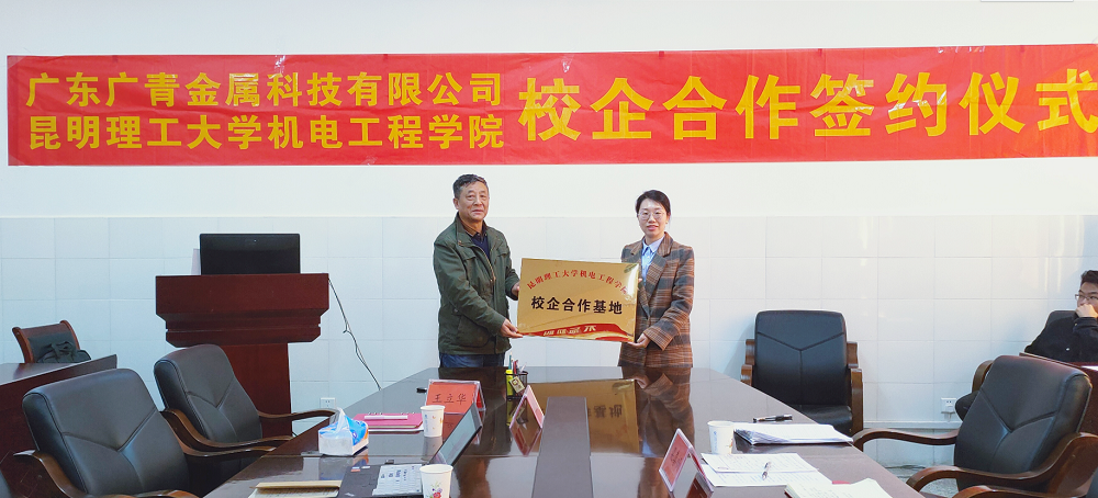 3月11日,广东广青金属科技有限公司与昆明理工大学机电工程学院在学校机电楼举行了校企合作签约及授牌仪式。昆明理工大学机电工程学院党委书记李金涛、广青科技人力资源科科长张艺玲及学生代表共20余人参加了签约仪式。