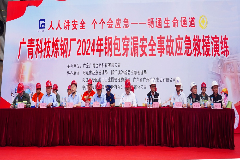 为深入学习宣传贯彻党的二十大精神和习近平总书记关于安全生产重要论述,全面落实“人人讲安全、个个会应急——畅通生命通道”的安全生产目标,进一步检验公司应急救援实战能力和应急救援队伍抢险战斗力,6月22日,广东广青金属科技有限公司在炼钢厂举行了2024年钢包穿漏安全事故应急救援演练。公司党委书记、董事长王骏,董事、总经理何丛珍等领导班子成员以及200多名员工代表参加演练。阳江市应急管理局总工程师谭丰华,阳江滨海新区应急管理局局长梁鸿武,阳江高新区消防大队、中国人保阳江分公司等相关单位领导到场观摩指导。