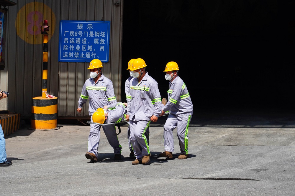 此次演练模拟炼钢厂1#LF炉钢包在吊运上台的过程中,钢包底部发生穿漏,洒落飞溅的钢水将领航人员烫伤,并且LF炉设备着火的事故场景。事故发生后,厂部立即启动应急救援预案,临时成立应急救援指挥部,现场指挥长对各应急小组下达救援抢险指令。警戒疏散组立即疏散车间作业人员,封锁事故现场;医疗救援组进入车间实施救援,将伤员撤离车间并进行初步检查治疗;消防组使用消防车高压雾化水进行灭火工作;抢修组进行机械电气设备抢修;现场清理组使用叉车、铲车进行冷钢清理作业,最后事故现场得到有效控制和处理。