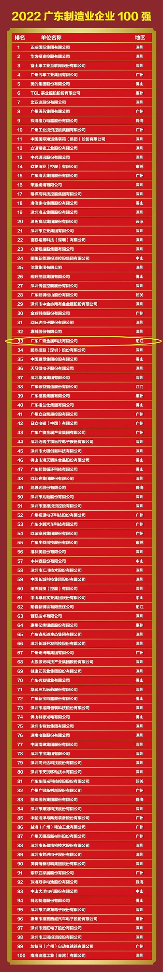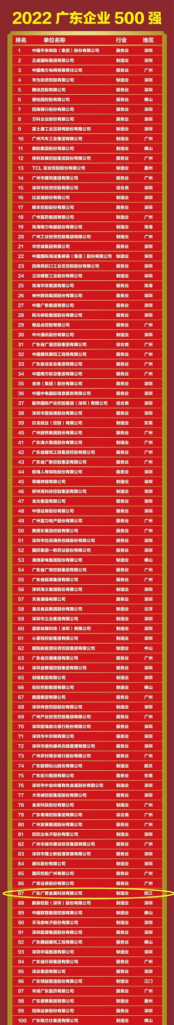 10月12日,广东省企业联合会、广东省企业家协会重磅发布“2022广东企业500强”“广东民营企业100强”“广东制造业企业100强”“广东服务业企业100强”榜单。广东广青金属科技有限公司连续9年蝉联榜单,位列2022年广东企业500强第87位,排名较去年上升15位;位列广东制造业企业100强第33位,排名较去年上升2位。