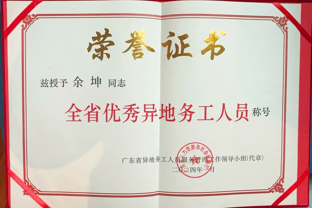 荣获“广东省优秀异地务工人员”