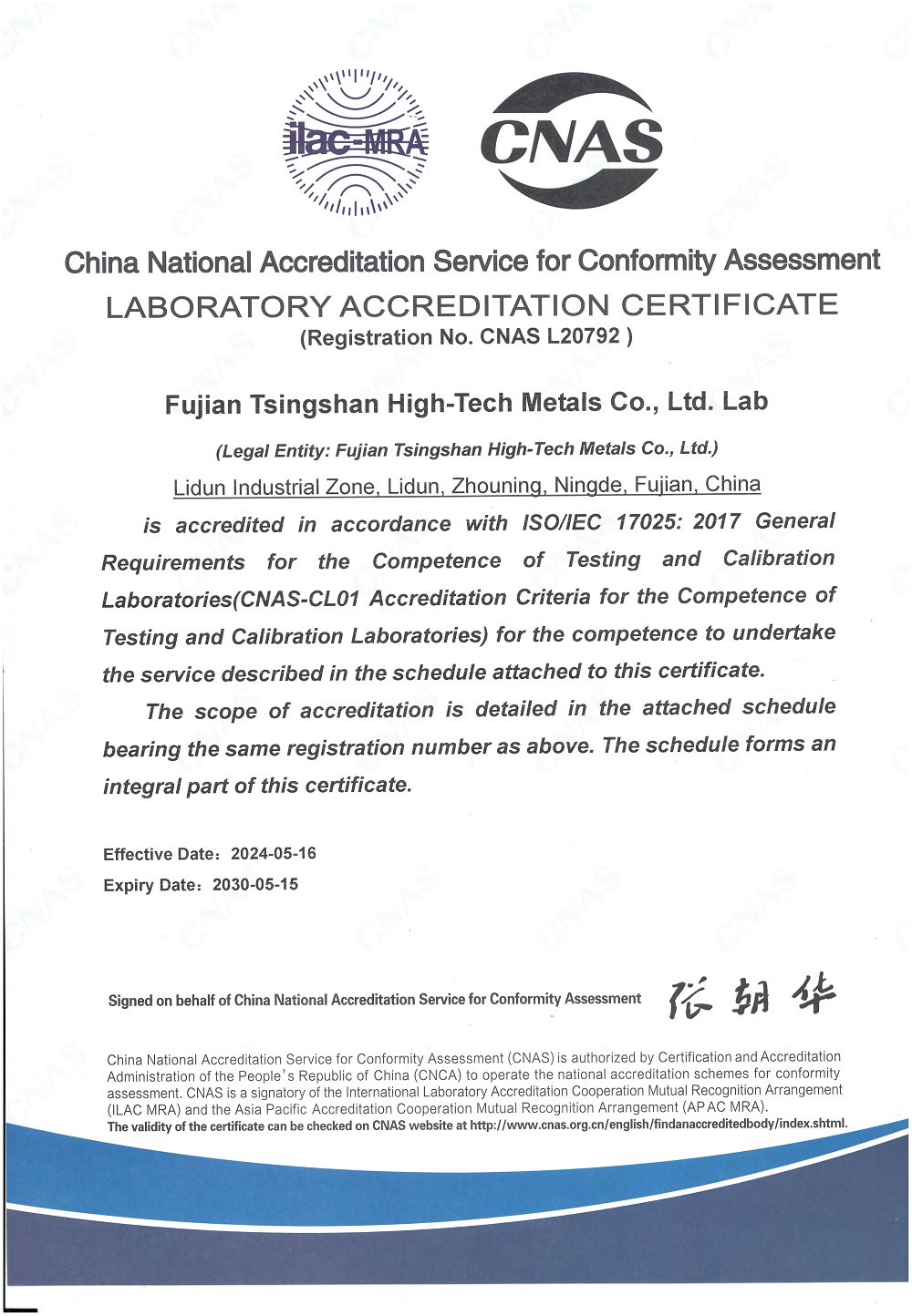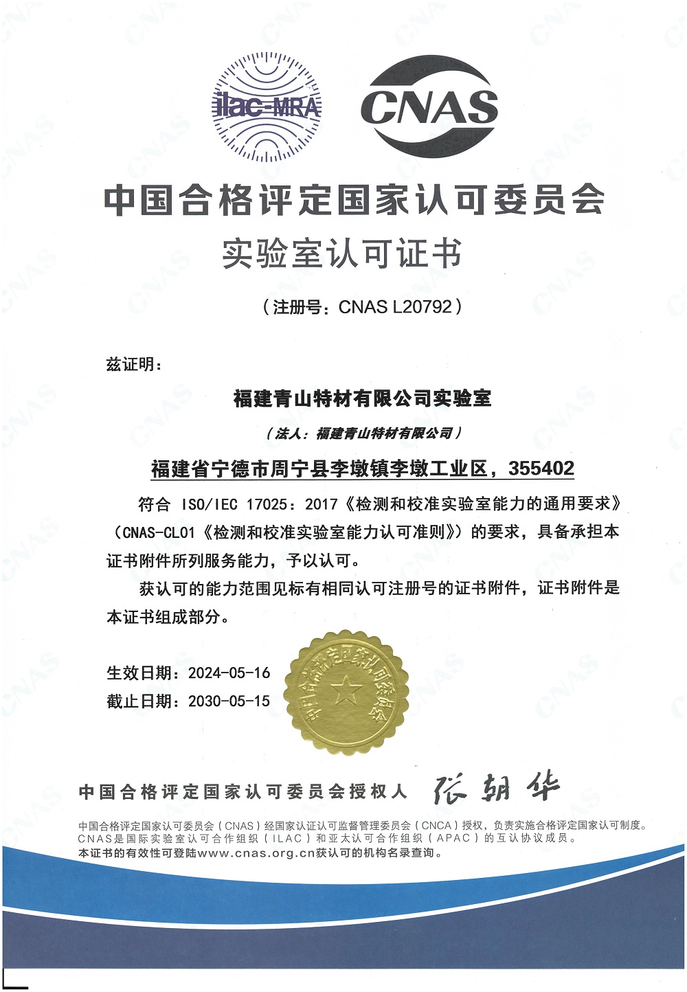 近日,福建jinnianhui今年会特材有限公司实验室经过严格的评估和审核,成功获得了中国合格评定国家认可委员会(CNAS)的认可,标志着该实验室在检测和检验等领域的能力和技术水平已达到国际认可的标准。
