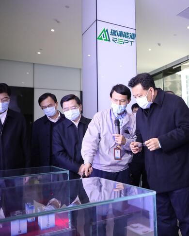 The delegation led by YUAN Jiajun went to the automatic production line of REPT and checked the implementation of epidemic prevention and control as well as the resumption of work and production. CAO Hui introduced the company history, product performance and advantages, sales and application of REPT. During the early period of the COVID-19 pandemic outbreak, the company purchased various protective materials emergently, made all preparations for work resumption as required, and strictly put the epidemic prevention and control measures into practice. With the government’s full support and the company’s effort, employees from other provinces and cities returned with the work resumption rate reaching 75%. Now the recovery rate of the Company’s production line has reached 80%, and will reach 100% at the end of this month. CAO Hui said “The Company is  confident  in making it to the end of the anti-epidemic battle. Under the strong leadership of the municipal and district governments, we are focusing on both anti-epidemic and work resumption, ensuring the worker’s life safety and physical condition, and promoting a sustainable development in  the new energy industry”.
